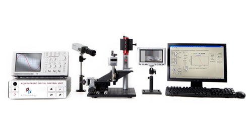 The TFT monitor/camera arrangement can be configured to watch the probe position on the sample or in higher magnification the separation of the tip and sample. On some surfaces this can be difficult to see by eye. Also with our smaller tips, e.g. 50 microns diameter, camera positioning is necessary. Note that this is used for initial tip position and as a general visual check to see where the tip is currently on the sample, for instance on several of our in-house systems the PC is separate for the optical table or desktop supporting the KP/SKP/RHC-KP.